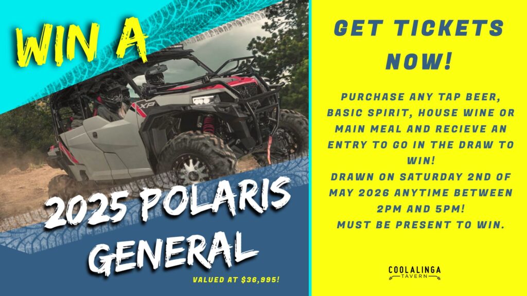 Come in and enjoy a drink with mates or a meal with the family and go into the draw to win a Polaris General to take them for a ride in!